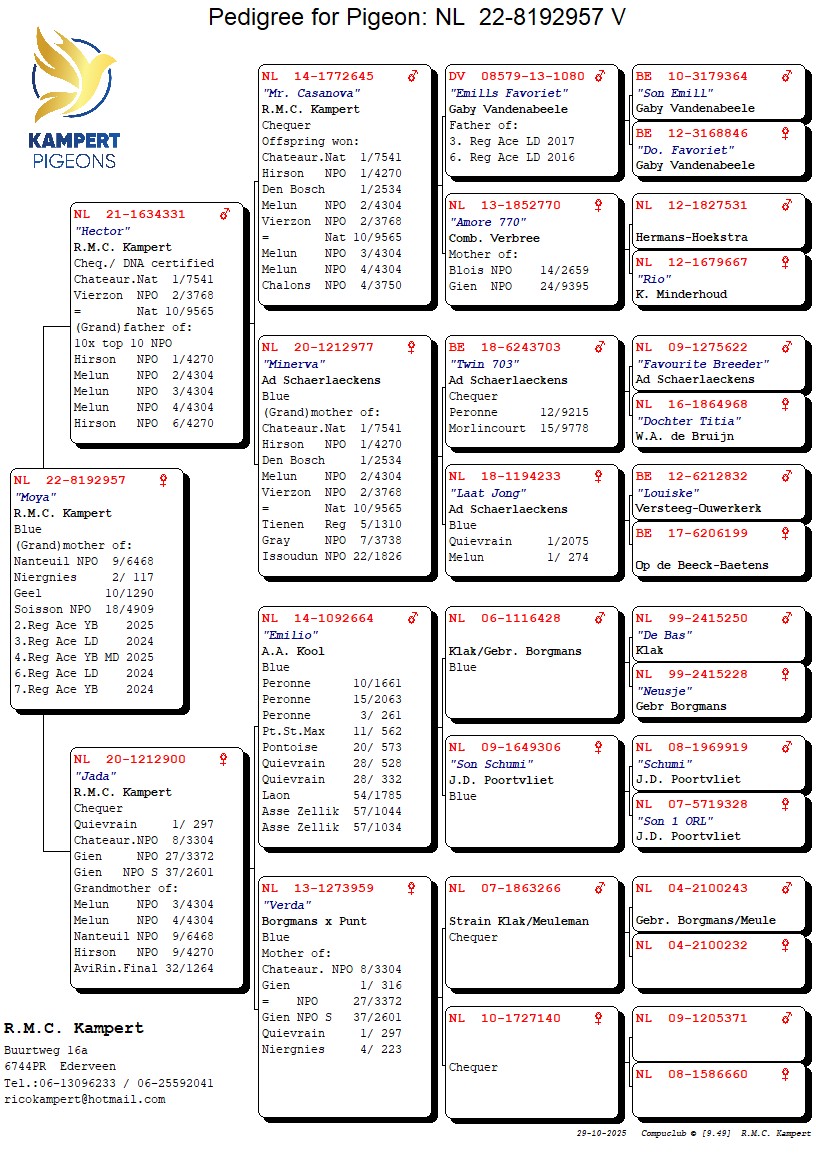 (G.)mother of 9. NPO Nanteuil 6,468 birds, 18. NPO Soisson 4,909 birds & 2.-3.-4.-7. reg. Ace and daughter of ‘Hector’, 1. Nat. Chateauroux 7,541 birds, 2. NPO Vierzon 3,768 birds & (g.)father of 10x top 10 NPO incl. 1. NPO Hirson 4,270 birds