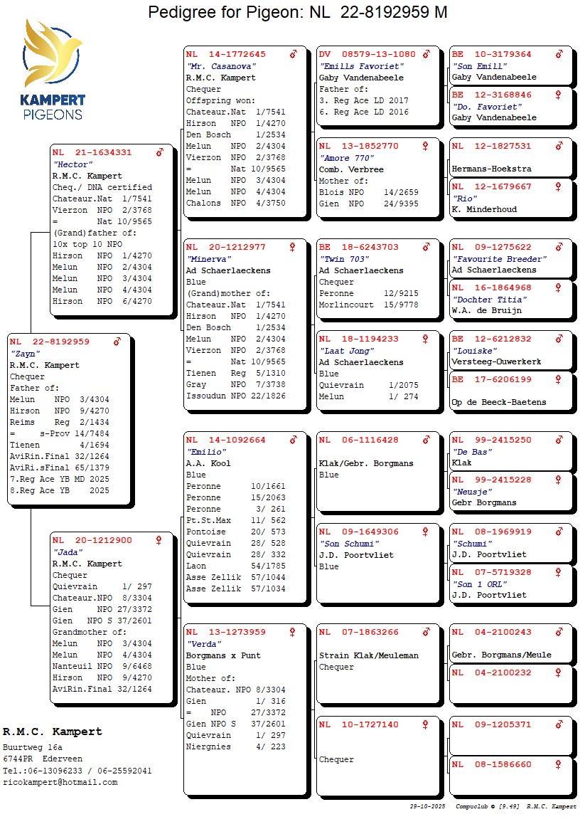Father of 3. NPO Melun 4,304 birds, 9. NPO Hirson 4,270 birds, 2. Reims 1,434 birds / 14. s-prov. 7,484 birds & 32. Final (521 km) AviRings OLR 1,264 birds 2024 and son of ‘Hector’, 1. Nat. Chateauroux 7,541 birds, 2. NPO Vierzon 3,768 birds & (g.)father of 10x top 10 NPO incl. 1. NPO Hirson 4,270 birds