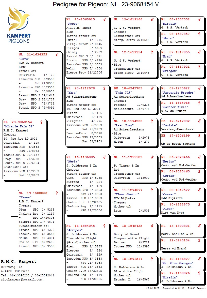 6. NPO Issoudun 3,553 birds & nestsister of 13. NPO Issoudun 3,553 birds and daughter of ‘Sanne’, 1. NPO Gien 5,235 birds & (g.)mother of 6x top 13 NPO/I.prov.