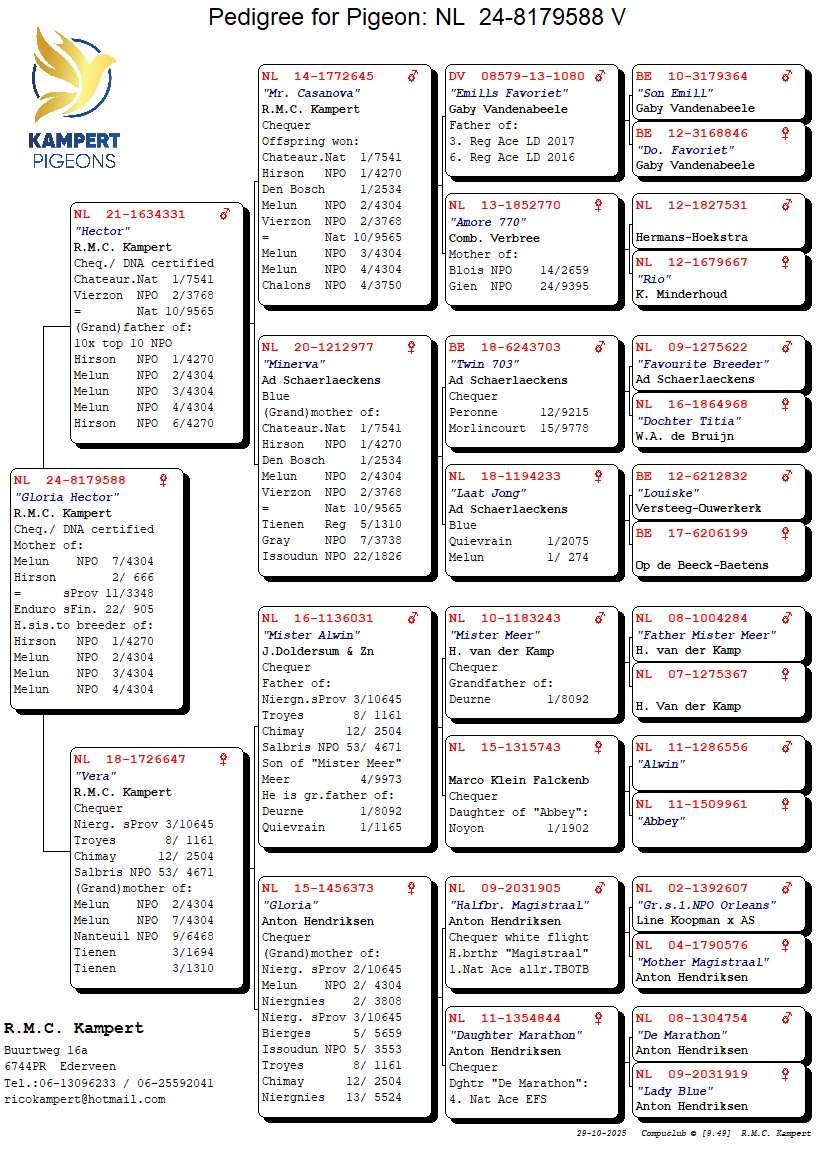 Mother of 7. NPO Melun 4,304 birds, 11. s-prov. Hirson 3,348 birds & 22. Semi Final Enduro OLR 2025 and daughter of ‘Hector’, 1. Nat. Chateauroux 7,541 birds, 2. NPO Vierzon 3,768 birds & (g.)father of 10x top 10 NPO incl. 1. NPO Hirson 4,270 birds x ‘Vera’, 3. s-prov. Niergnies 10,645 birds & (g.)mother of 3x top 10 NPO