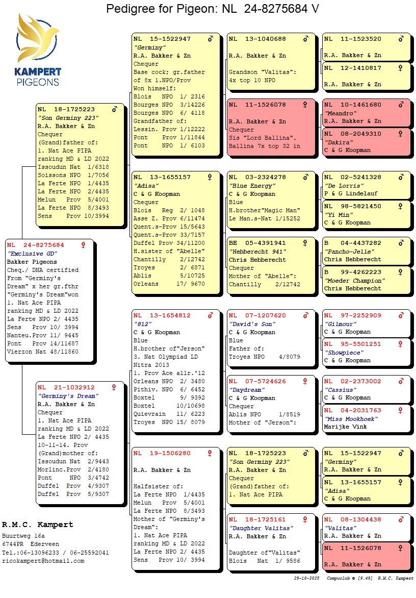 Rechtstreeks Ruud & Dolf Bakker bred from ‘Germiny’s Dream’, 1. Nat. Ace PIPA ranking middle distance / long distance 2022, 2.-10.-11.-14. NPO/prov. & (g.)mother of 2.-2.-3.-4.-5.-5.-6.-8. Nat./NPO/prov. x her grandfather ‘Son Germiny 223’, also (g.)father of 1. Nat. Issoudun 6,318 birds, 1. NPO Soissons 7,056 birds & 1. NPO La Ferte 4,435 birds