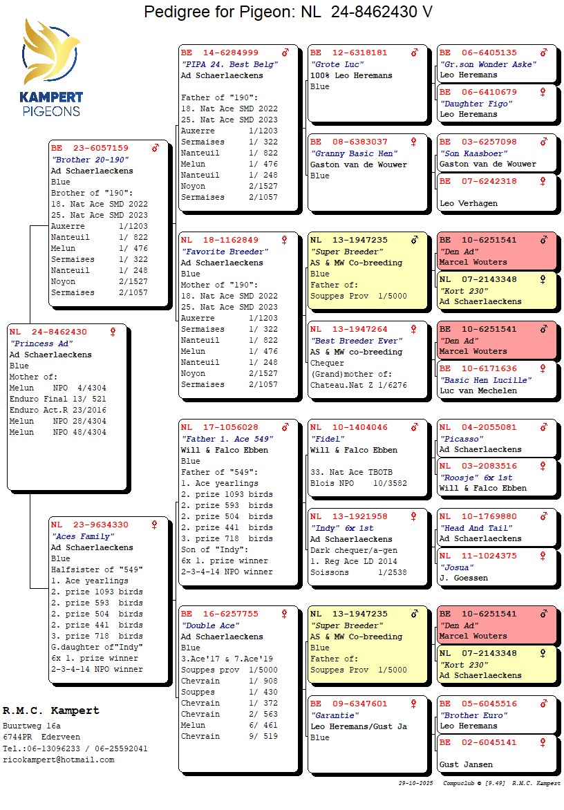 original Ad Schaerlaeckens mother of 4.-28.-48. NPO Melun 4,304 birds & 13. Final Enduro OLR 2025 and bred from brother ’20-190′, 18.-25. Nat. ace KBDB short middle distance 2022/2023 & 5x 1. prize