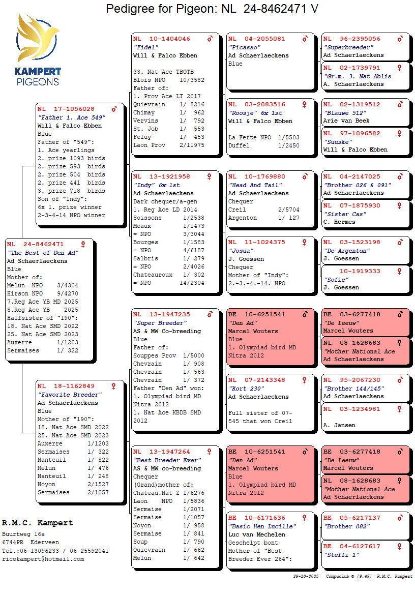 original Ad Schaerlaeckens mother of 3. NPO Melun 4,304 birds & 9. NPO Hirson 4,270 birds and halfsister of ’20-190′, 18.-25. Nat. Ace KBDB short middle distance 2022/2023 & 5x 1. prize