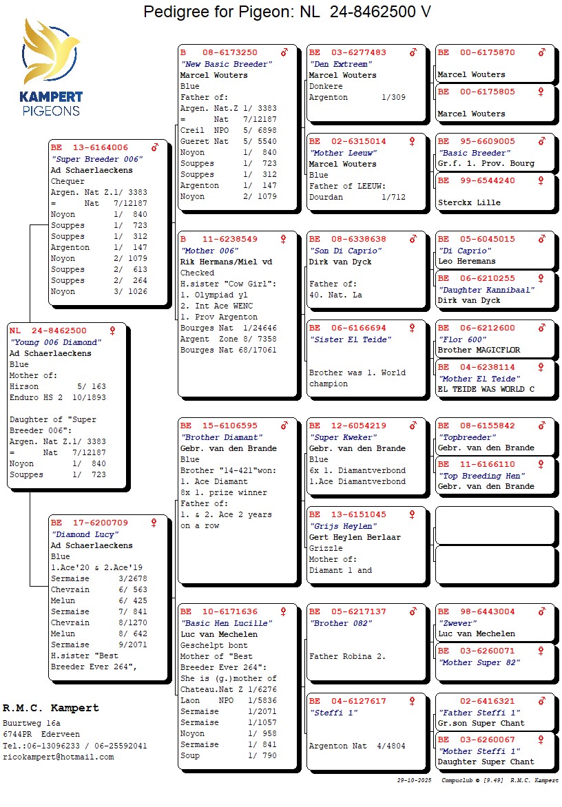 original Ad Schaerlaeckens. Dochter van ‘Super Breeder 006’, won 5x 1e tegen gemiddeld +1.050 duiven waaronder 1. Nat. Zone Argenton tegen 3.383 duiven / 7. Nat. 12.187 duiven x ‘Diamond Lucy’, 1. & 2. Ace, 3. Sermaise 2.678 duiven & halfzus van ‘Best Breeder Ever’, grootmoeder van 1. Nat. Zone Chateaudun 6.276 duiven & 1. NPO Laon 5.836 duiven