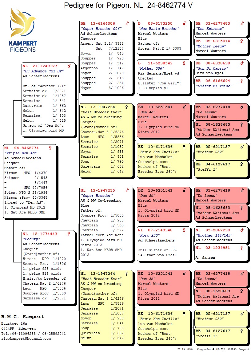 original Ad Schaerlaeckens mother of 1. NPO Hirson 4,270 birds and double g.daughter ‘Best Breeder Ever’, g.daughter ‘Super Breeder 006’ & ‘Super Breeder 235’ and inbred to ‘Den Ad’, 1. Olympiad bird middle distance Nitra 2013 & 1. Nat. Ace KBDB short middle distance 2012