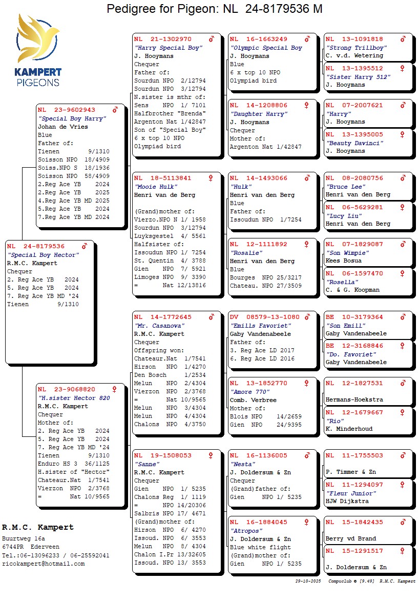 2. reg. Ace YB & 7. reg. Ace middle distance YB 2024 and bred from ‘Special Boy Harry’, brother 3. NPO Sourdun 12,794 birds x halfsister ‘Hector’, 1. Nat. Chateauroux 7,541 birds, 2. NPO Vierzon 3,768 birds & (g.)father of 10x top 10 NPO including 1. NPO Hirson 4,270 birds and daughter of ‘Sanne’ 1. NPO Gien 5,235 birds & 6x top 13 NPO/I.prov.