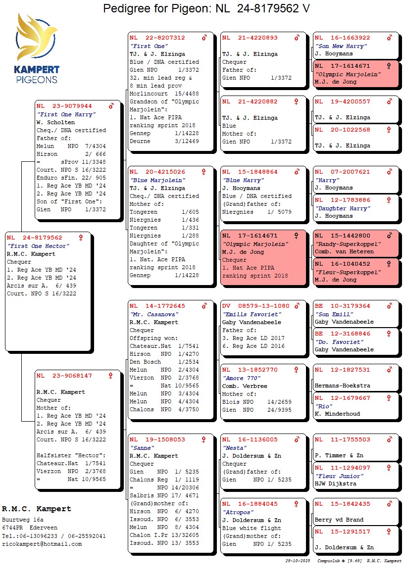 1. reg. Ace middle distance YB 2024 & 2. reg. Ace middle distance YB 2024 and bred from son ‘First One’ 1. NPO Gien 3,372 birds (owned by W. Scholten & original Elzinga) x halfsister ‘Hector’, 1. Nat. Chateauroux 7,541 birds, 2. NPO Vierzon 3,768 birds & (g.)father of 10x top 10 NPO incl. 1. NPO Hirson 4,270 birds and daughter of ‘Sanne’ 1. NPO Gien 5,235 birds & 6x top 13 NPO/I.prov.
