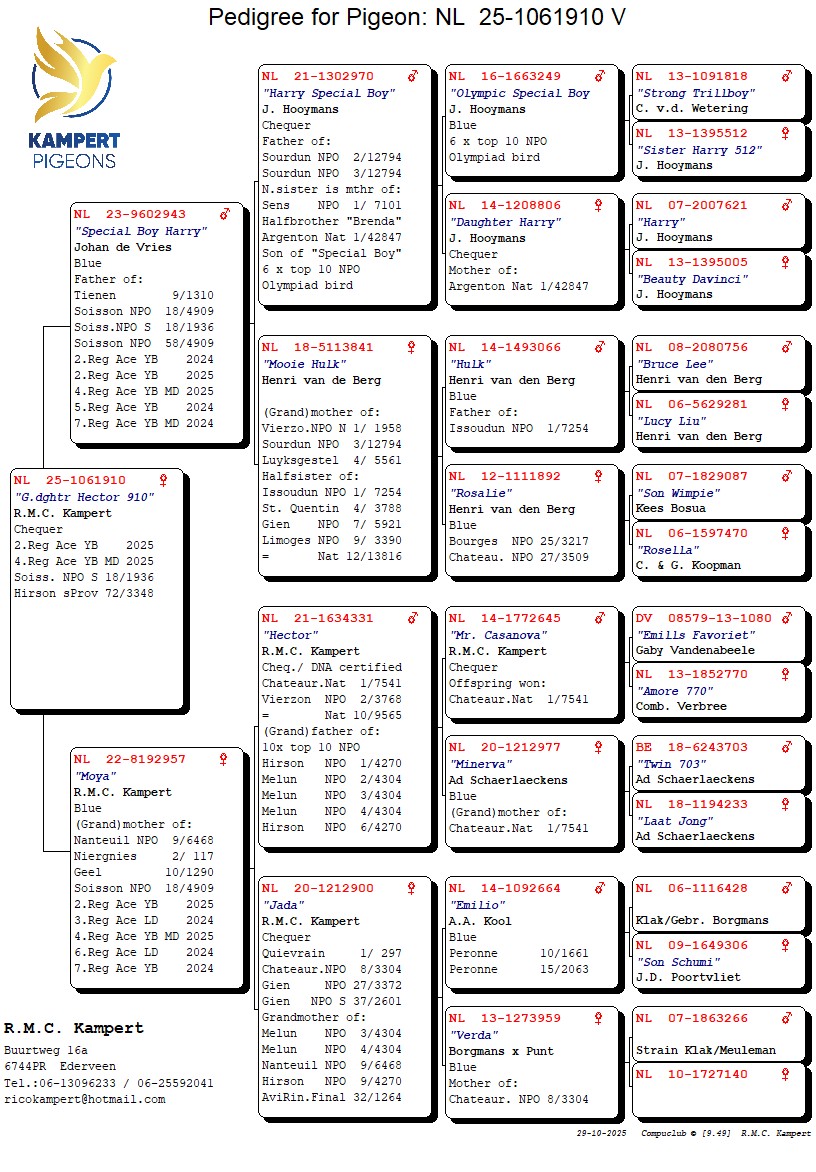 2. reg. Ace youngsters & 5. reg. Ace middle distance YB 2025 and g.daughter of ‘Hector’, 1. Nat. Chateauroux 7,541 birds, 2. NPO Vierzon 3,768 birds & (g.)father of 10x top 10 NPO incl. 1. NPO Hirson 4,270 birds