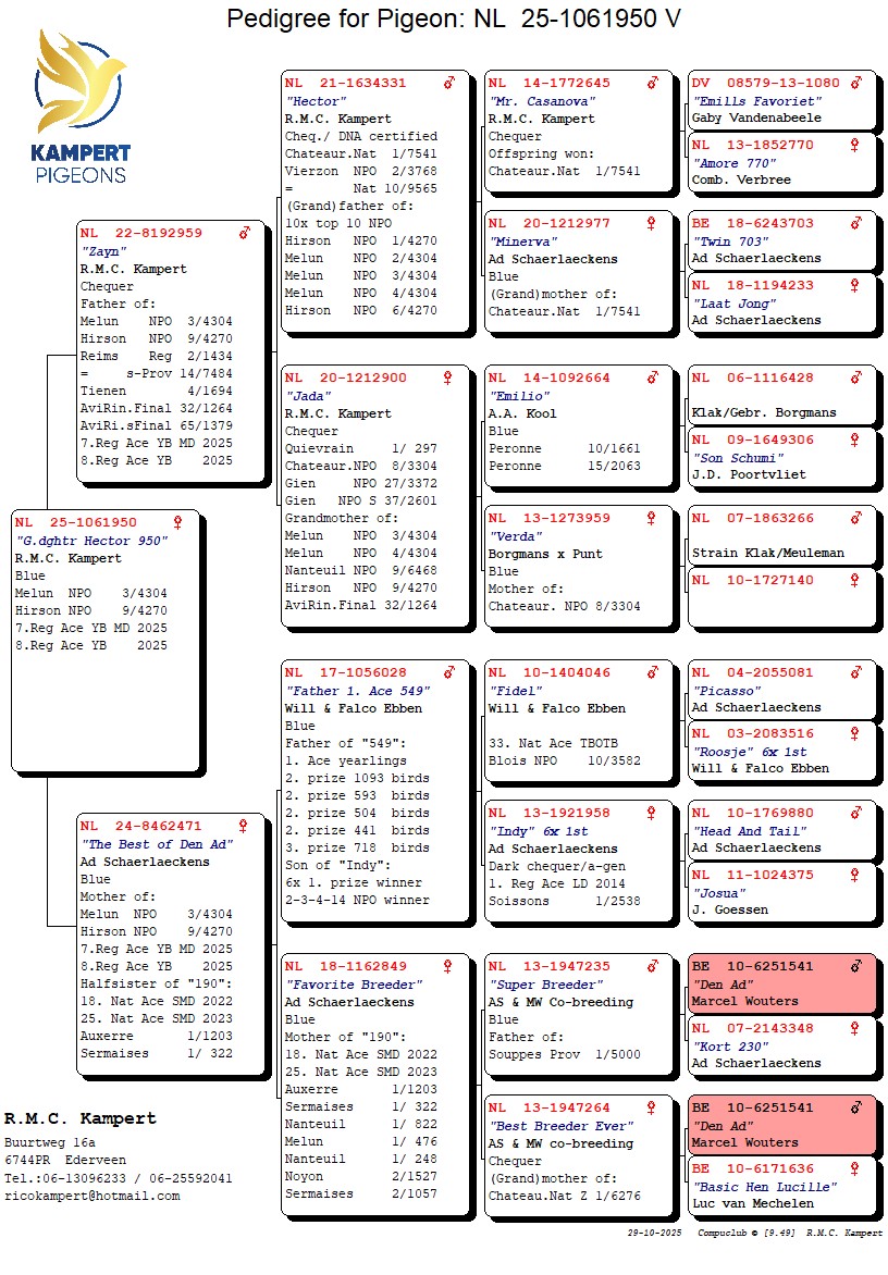 3. NPO Melun 4,304 birds & 9. NPO Hirson 4,270 birds and g.daughter of ‘Hector’, 1. Nat. Chateauroux 7,541 birds, 2. NPO Vierzon 3,768 birds & (g.)father of 10x top 10 NPO incl. 1. NPO Hirson 4,270 birds