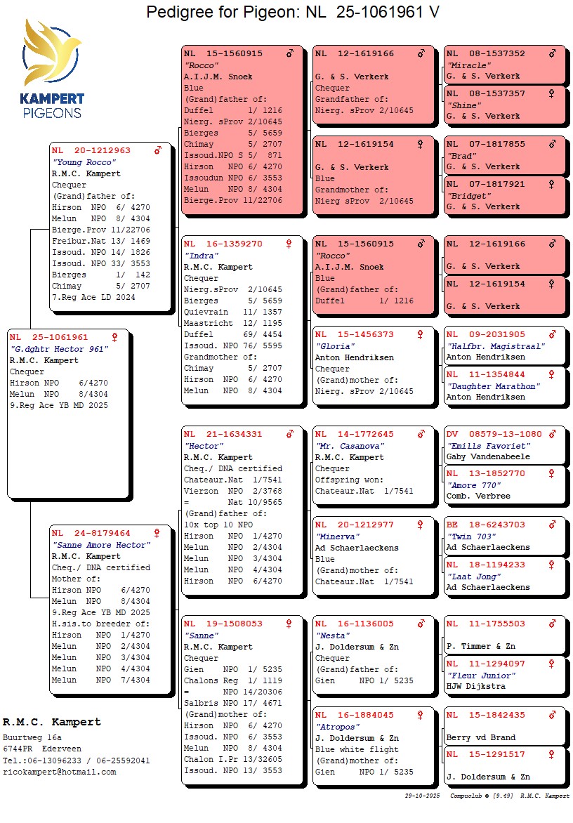6. NPO Hirson 4,270 birds & 8. NPO Melun 4,304 birds and g.daughter of ‘Hector’, 1. Nat. Chateauroux 7,541 birds, 2. NPO Vierzon 3,768 birds & (g.)father of 10x top 10 NPO incl. 1. NPO Hirson 4,270 birds