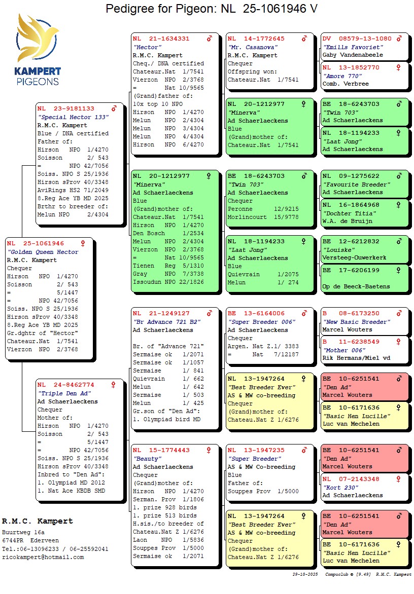 1. NPO Hirson 4.270 duiven. Gekweekt uit ‘Special Hector 133’ (zoon ‘Hector’, 1. Nat. Chateauroux 7.541 duiven, 2. NPO Vierzon 3.768 duiven & (g.)vader van 10x top 10 NPO) x ‘Triple Den Ad’ Ad Schaerlaeckens, kleindochter van ‘Best Breeder Ever’, Super Breeder 006′ & ‘Super Breeder 235’